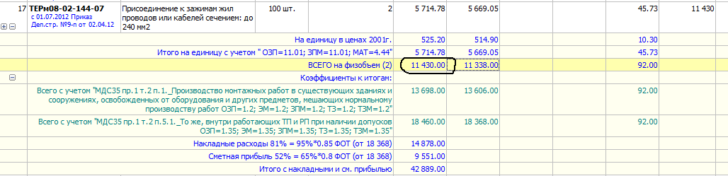 умножаем на физобъем =2 получим: левая часть выражения: ПЗ = окр(5714,78 * 2;2) = 11430,00 правая часть выражения: ОЗП = окр(5669,05 * 2; 2) = 11338,00 МАТ = окр (45,73 ; 2) = 91. далее сложим обе цифры и получим 11429