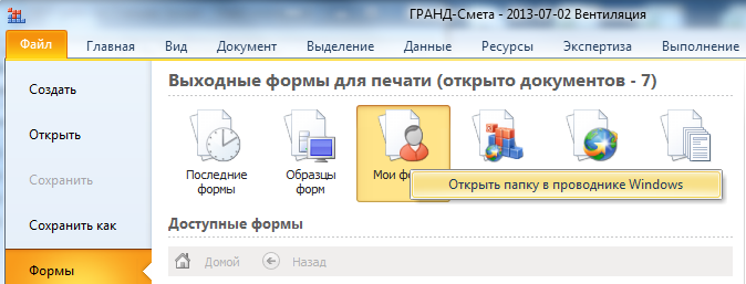 По крайней мере, в этой версии команда «Открыть папку в проводнике Windows» из контекстного меню кнопки «Мои формы» успешно работает…