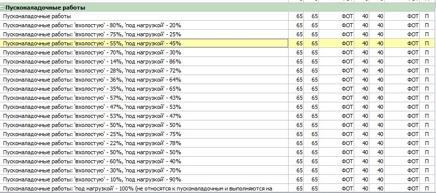 Подскажите, откуда берутся название видов работ в справочнике видов работ "гранд-сметы"  ?   Прикрепляю фото.  Из какой бумажки взято название "Пусконаладочные работы: 'вхолостую' - 35%, 'под нагрузкой' - 65%" . Заказчика смущает это название и он просит его заменить.  И где написано сколько именно %   'вхолостую' а сколько 'под нагрузкой'  для каждой расценки ?