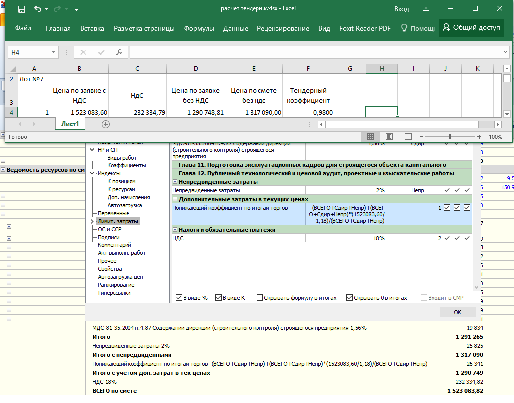 К сожалению, я больше "по старинке" Делим сумму предложения на стоимость закупки и получаем тендерный коэффициент. Далее заносим в одну из строк (базисным - первую, ресурсным - вторую) и смотрим на результат.