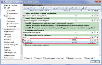 Примерно для таких случаев в лимитированных затратах предусмотрена группа «Дополнительные работы и затраты». НДС можно включить в эту группу с уровнем 1, а потом добавить ещё сколько угодно строк, где значение задано в денежном выражении или какой-либо формулой.
