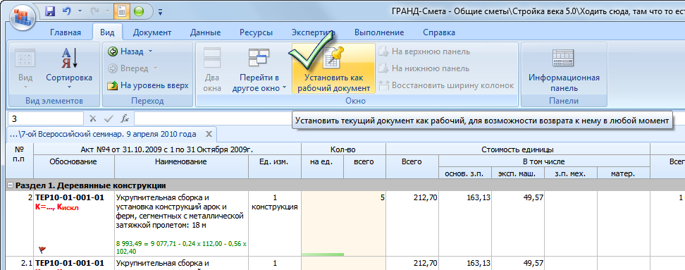 если смета "закреплена" как рабочая, то где бы она там ни была на вкладках -кнопка Смета вернет вас именно к ней... мало того. если у вас открыта всего одна смета, то кнопка Смета будет возвращать вас именно к ней, сколько бы сборников не было открыто. Данная команда выполняет переход к последней просмотренной смете