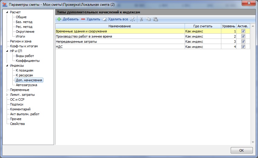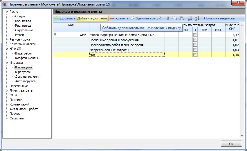 Честно говоря, я не додумался до такого «извращения» – вводить лимитированные как дополнительные начисления к индексам По крайней мере, это уж точно не самый очевидный вариант… Но результат получается вполне адекватный, так что всем заинтересованным – welcome! Локальная смета – с традиционным начислением ЛЗ: Локальная смета (2) – сначала формируем список дополнительных начислений: Локальная смета (2) – добавляем дополнительные начисления к индексу и указываем их значения: Локальная смета (2) – наслаждаемся результатом (и сравниваем с первой «традиционной» сметой):