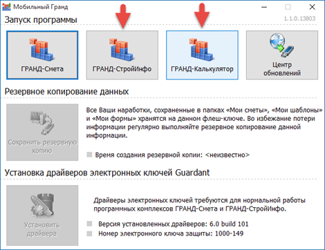 Зена, если на флешке отсутствует папка \Grand\Grand Calculator, тогда и соответствующая кнопка будет неактивной. Аналогично для «ГРАНД-СтройИнфо» (папка \Grand\StroyInfo). Проверьте комплектацию своей флешки.