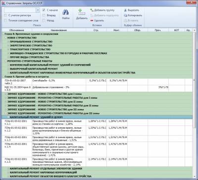 Кстати о ССР, обратите внимание на наш новый справочник "Затраты ОС/ССР" (это файл Oszatr). Туда наконец-то в полном объёме введены все нормативы временных и зимних из сборников ГСН и ГСНр, причём зимние – для всех восьми температурных зон. Вот так он должен теперь выглядеть: