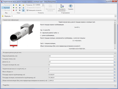 Попробовала в Калькуляторе просчитать объем окраски и изоляции стальной трубы. Вот скриншот Во-первых - зачем выбирать толщину стенки, если от нее никак не зависит расчет? Во-вторых - площадь окраски трубы - стоит значение 0. Почему? Программа просто не считает площадь. Далее. Считаем покровный слой, сверху теплоизоляции. программа показывает - 31,41 и т.р. м2. При расчете по формуле на калькуляторе получаем 3,14*(0,125+2*0,05)*100 = 70,65, что в два раза больше, нежели посчитала программа. Далее, считаем объем теплоизоляции. самый простой способ - техчасть 26 сб. Получаем 3,14*(0,125+0,05)*0,05*100 = 2,7475 м3. Объем теплоизоляции программа выдает зачем-то в м2 - 0,785398 (а для чего мы вообще тогда толщину уточняем, если нам считается площадь?). Ужас ужасный.