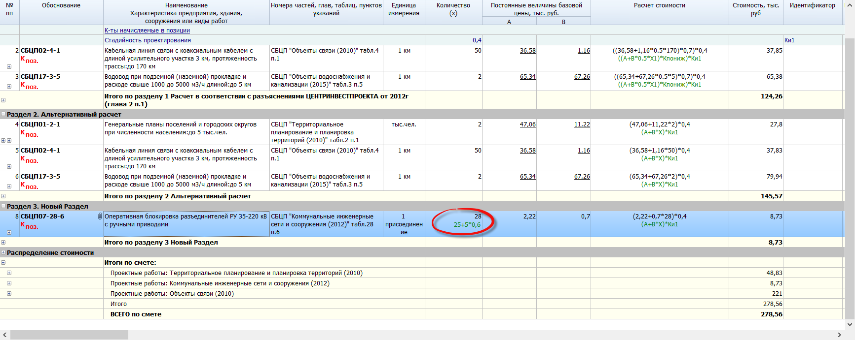 При наличии однотипных присоединений в РУ стоимость проектирования по пунктам 6 и 7 таблицы № 28 настоящего Справочника определяется по формуле: а + в (x + X1*K),