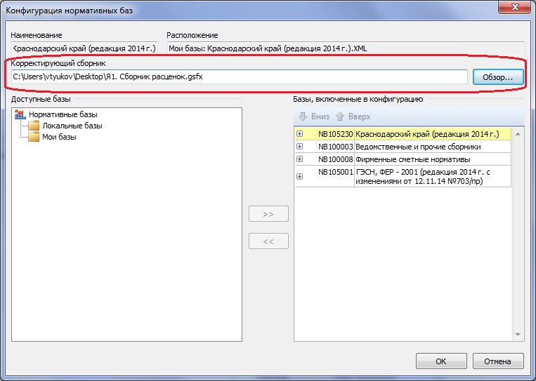 Он на компьютере в виде файла .gsfx или .xml сохраняется, поэтому открываете в программе свой сборник расценок просто как отдельный документ. А подключить его к текущей активной нормативной базе, чтобы можно было добавлять в смету расценки из него просто по обоснованию, можно вот так: