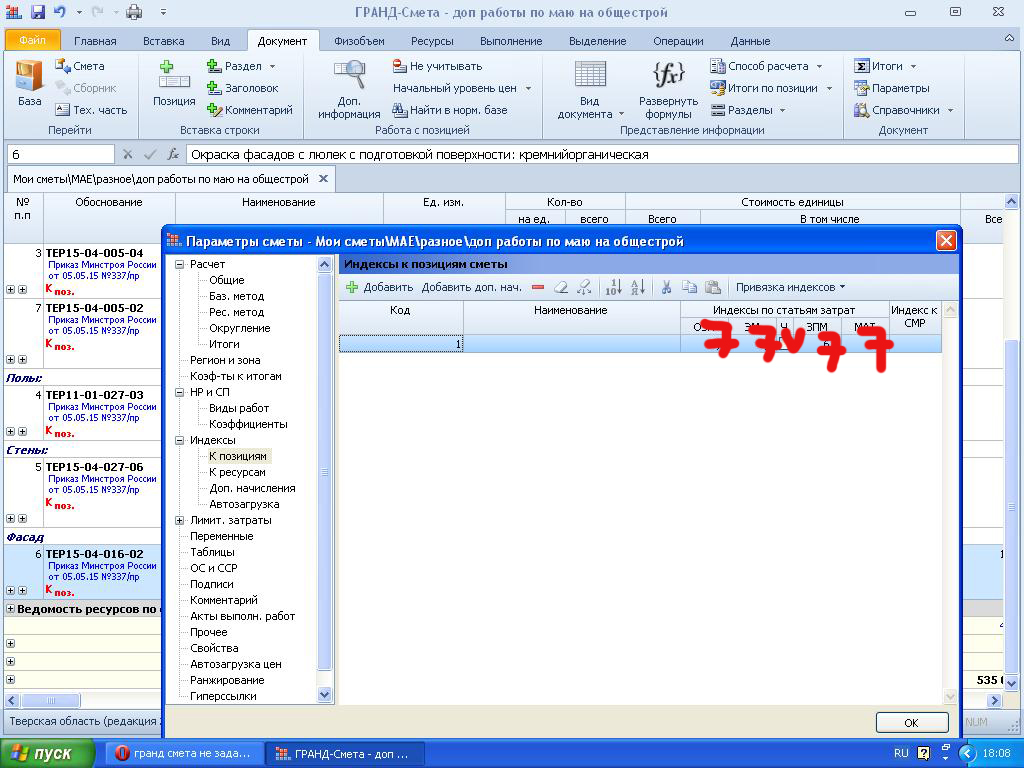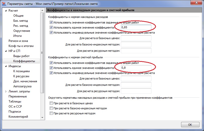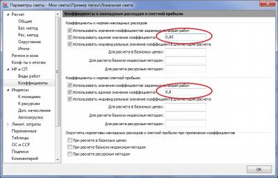 stk4m, наворотили вы конечно очень много всего лишнего, а проще всего вам было бы поступить следующим образом: во-первых, никакой шаблон настроек расчёта не выбираете, и тогда в параметрах сметы на закладке «Индексы» у вас переключатель остаётся в позиции «Не использовать индексы», благодаря чему программа не выделяет позиции красным цветом. Индекс пересчёта (в вашем случае – произведение 7*0,8) вводите в параметрах сметы на закладке «Индексы» как единый индекс к итогам, а коэффициенты 0,85 к нормам накладных расходов и 0,8 к нормам сметной прибыли – на закладке «НР и СП >> Коэффициенты» как единое значение коэффициента.