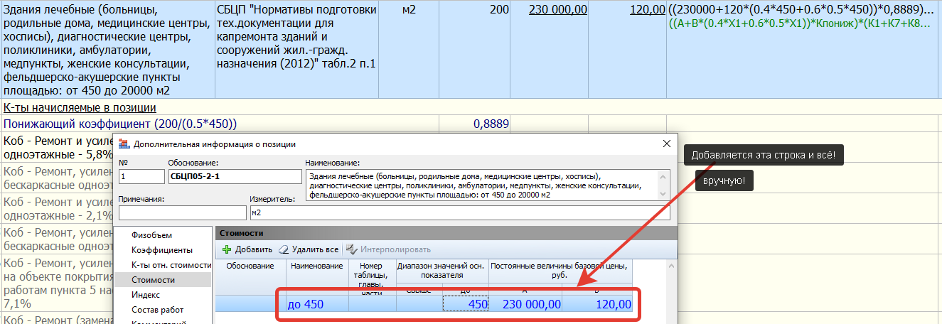 При составлении сметы по сборнику СБЦП-05 "Нормативы подготовки тех.документации для капремонта зданий и сооружений жил.-гражд. назначения (2012)" необходимо применение расчётного понижающего коэффициента через экстраполяцию/интерполяцию. Гранд-смета сама что-то не хочет считать понижающий коэффициент для СБЦП-05 (хотя для других сборников считает). Подскажите, что, куда надо вставить (лучше в виде файла гранд-сметы), что бы вёлся расчёт по формуле: или Ц = a + b * (0,4* Xmin + 0,6 * Xзад.), или Ц = a + b * (0,4* Xmax + 0,6 * Xзад.). ---------------------- Всё оказалось просто (почему сразу не сделать в программе в СБЦП-05 эту настройку) - во вложении