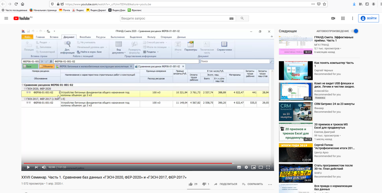 23. Проверка и сравнение смет (смотреть полностью) Удобная работа: − Как настроить нормативную базу? (00:53) − Где найти в ПК «ГРАНД-Смета» официальные индексы по регионам РФ? (04:03) − Как удобно хранить сметную документацию? (06:12) − Как облегчить проверку сметы? (08:17) Проверка сметы: − Как проверить, исправлялись расценки или нет? (09:24) − Как проверить НР и СП, индексы и текущие цены? (15:58) − Как сравнить смету с её предыдущим вариантом? (20:03) Работа с документом: − Как работать с цветовыми пометками в смете? (22:48) − Как ПК «ГРАНД-Смета» может помочь при проверке составов работ, физобъёмов и начислений в смете? (26:01)