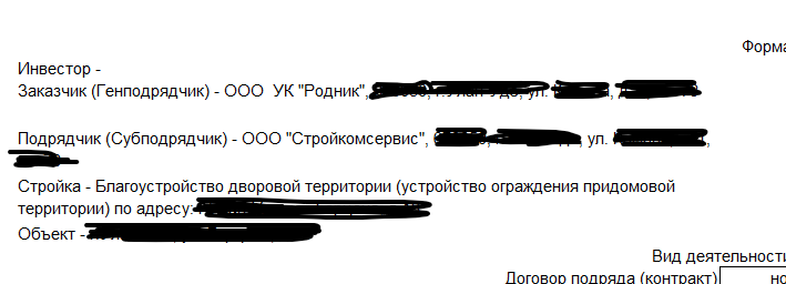 Если в журнале типовых форм посмотреть унифицированную форму № КС-2 согласно постановлению Госкомстата России от 11.11.99 № 100, то в ней предусмотрен вывод в строке Инвестора (Заказчика, Подрядчика) только названия организации и её адреса, телефона, факса. Плюс справа в рамке в отдельных полях – код по ОКПО, а также для Подрядчика ещё номер и дата договора. Соответственно, все иные реквизиты, даже если они заданы в параметрах акта, программа при формировании документа игнорирует.