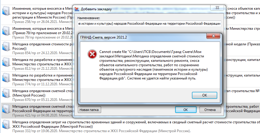 При попытке добавить Методику 421/пр в закладки программа выдает ошибку