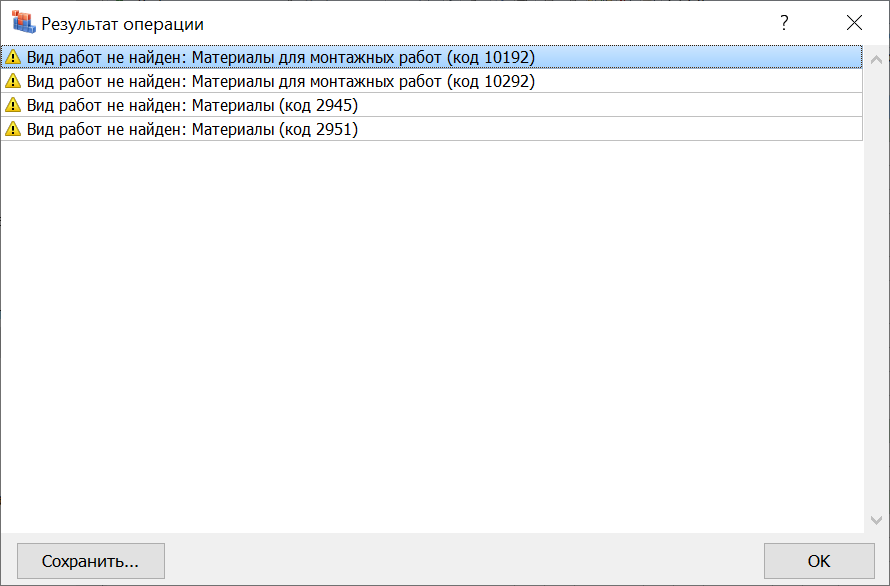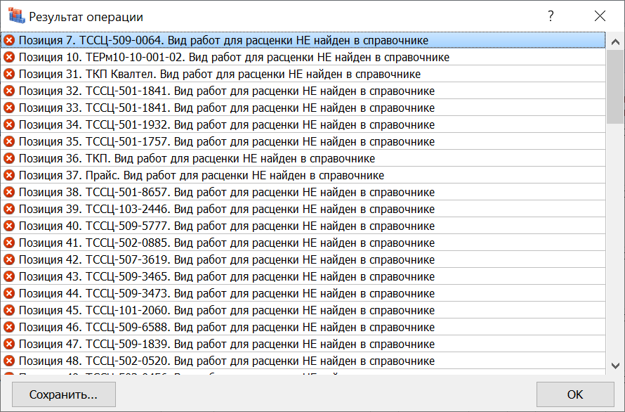 4. Нажал кнопку «Проверка НР и СП» на панели инструментов на вкладке «Операции», в последующих окнах ничего не менял, получил результат операции: Очевидно, что во всех перечисленных позициях использованы расценки, для которых в нормативной базе не задан вид работ, либо эти позиции введены вручную – об этом программа и сообщает.