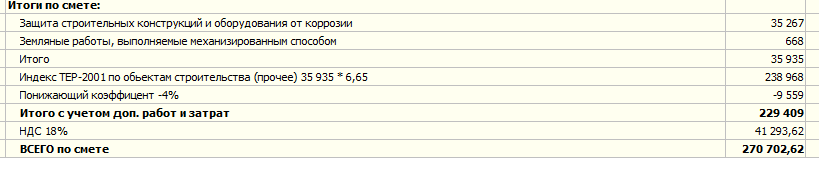 Спасибо за ответы. Дело в том что понижающий коэффициент добавляю, но сумма не изменяется. И проблема еще такая. Я беру старую смету с постатейными индексами - сумма 498 т.р. Забиваю ее в гранд смету по новой и ставлю общий индекс из письма мин. строй. России (объект строительства - прочее) 6,65 и сумма получается 250 с копейками... Неужели расхождение индексов в два раза? или я что то не так делаю?