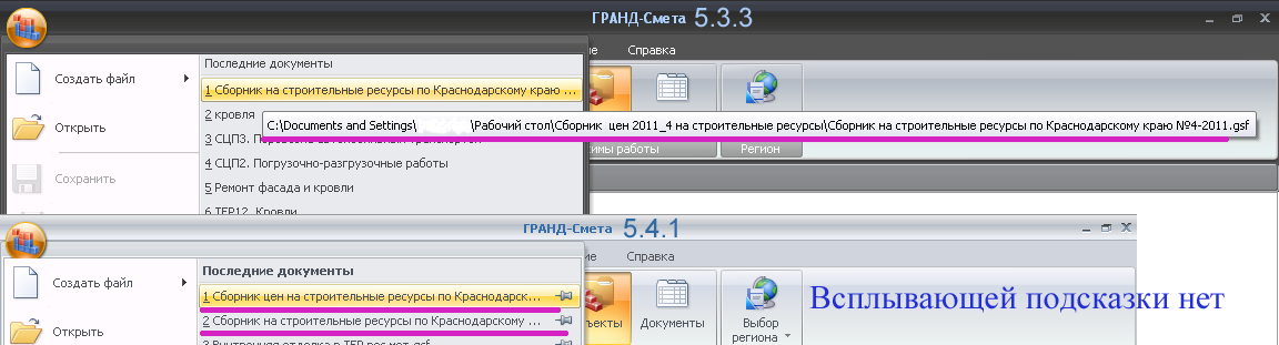 В версии 5.4.1 программа перестала показывать всплывающие подсказки в меню открытия файлов