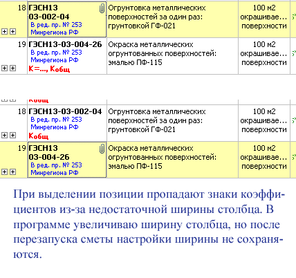 Версия 5.4.1. При выделении позиции пропадают знаки коэффициентов из-за недостаточной ширины столбца. В программе увеличиваю ширину столбца, но после перезапуска сметы настройки ширины не сохраняются.