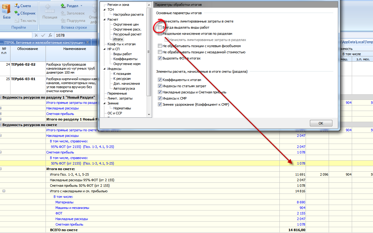 ключевое слово - укрупненные нормативы, т.е. выделять виды работ не надо... параметры сметы - расчет - итоги. снимаем галочку Всегда выделять виды работ. RTFM