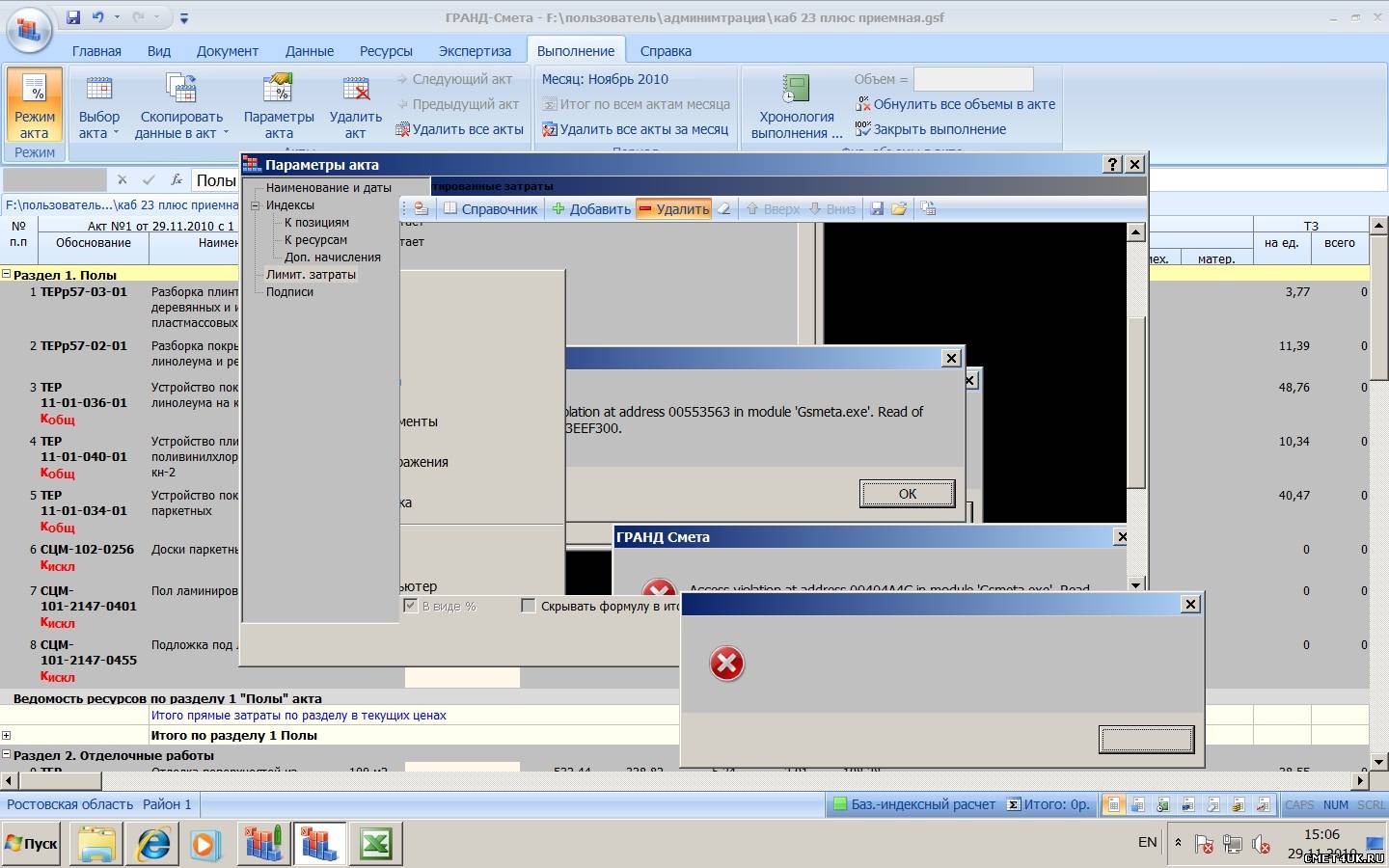 на версии флэш который раз выползает ошибка: в режиме выполнения, создав новый акт, копируем данные из сметы, в параметрах нужно убрать непредвиденные: программа при выделении этой строчки копирует ее, при попытке удалить обе строчки выдает ошибку и зависает, отключается только через диспетчер задач. благо что все эти манипуляции происходят на начальном этапе, когда в акте еще нет данных об объемах выполнения.