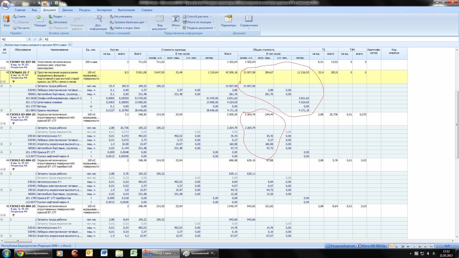 Позиция 42: В позиции сметы показывается расчет от стоимости единицы с точностью до копеек: 3647,95 * 8,5 = 31007,58 (31007,575) В ресурсах в данном случае показывается расчет от заданной цены ресурса с перемножением на нормативный расход без промежуточного округления: 109,22 * 33,4 * 8,5 = 31007,56 (31007,558).