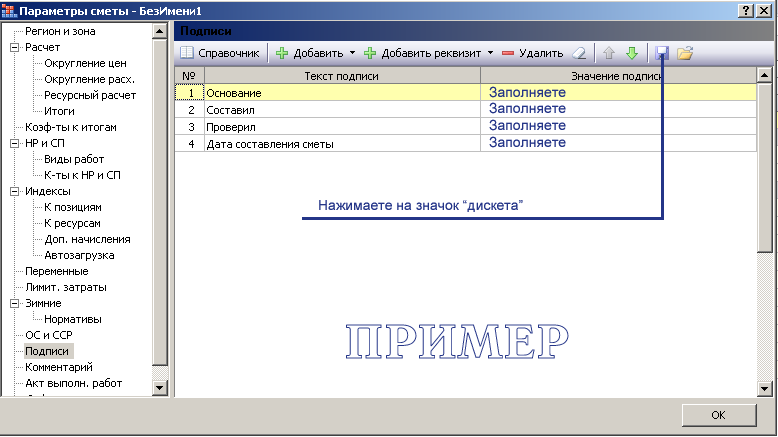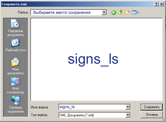 А-030, можно сделать так: Создаете нужные подписи, нажимаете "дискетку", указываете путь сохранения, имя файла signs_ls. Потом этот файл копируете в папку LocalSetting (перезаписываете старый, который на всякий случай куда-нибудь сохраните).