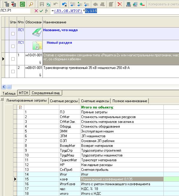 Посмотрите скриншот. В открытой смете в Лимитированных затратах пролистайте, к примеру, на "Итоги по объекту". Если по ним есть шаблон, который я вам высылал, то встаньте на строчку 15 как на скриншоте. Наверху вы увидите строку формул (как в excel). Там и живет Ваш коэффициент 0.135. Мышкой становитесь в строчку формул и меняете коэффициент на любой другой (после изменений не забываем нажать зеленую галочку левее от формулы). Название в самой 15 строчке меняем (2-ой клик мышкой и меняйте на здоровье). Если хотите сохранить его, чтобы потом не создавать, то после редактирования нажмите на любой строчке ПКМ и выберите Действия>> Сохранить как шаблон.