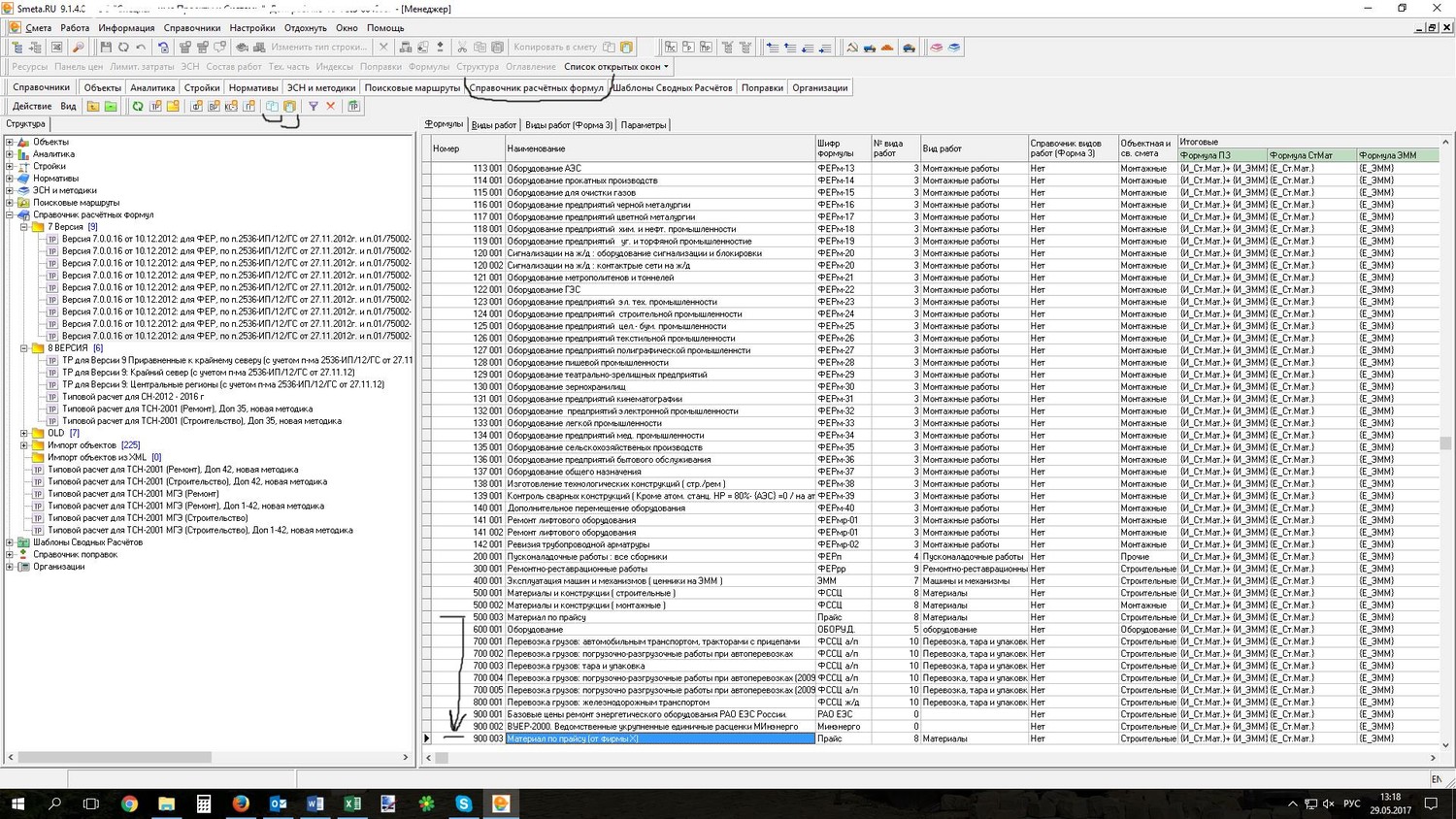 3 в окне напротив № формулы или тип работ справа жмем кнопку, откроется окно с формулами или типом работ.4 меняем формулу или тип работ, в окне с формулами жмем выбрать, вместе с формулами поменяется и тип работ для выделенных расценок.
