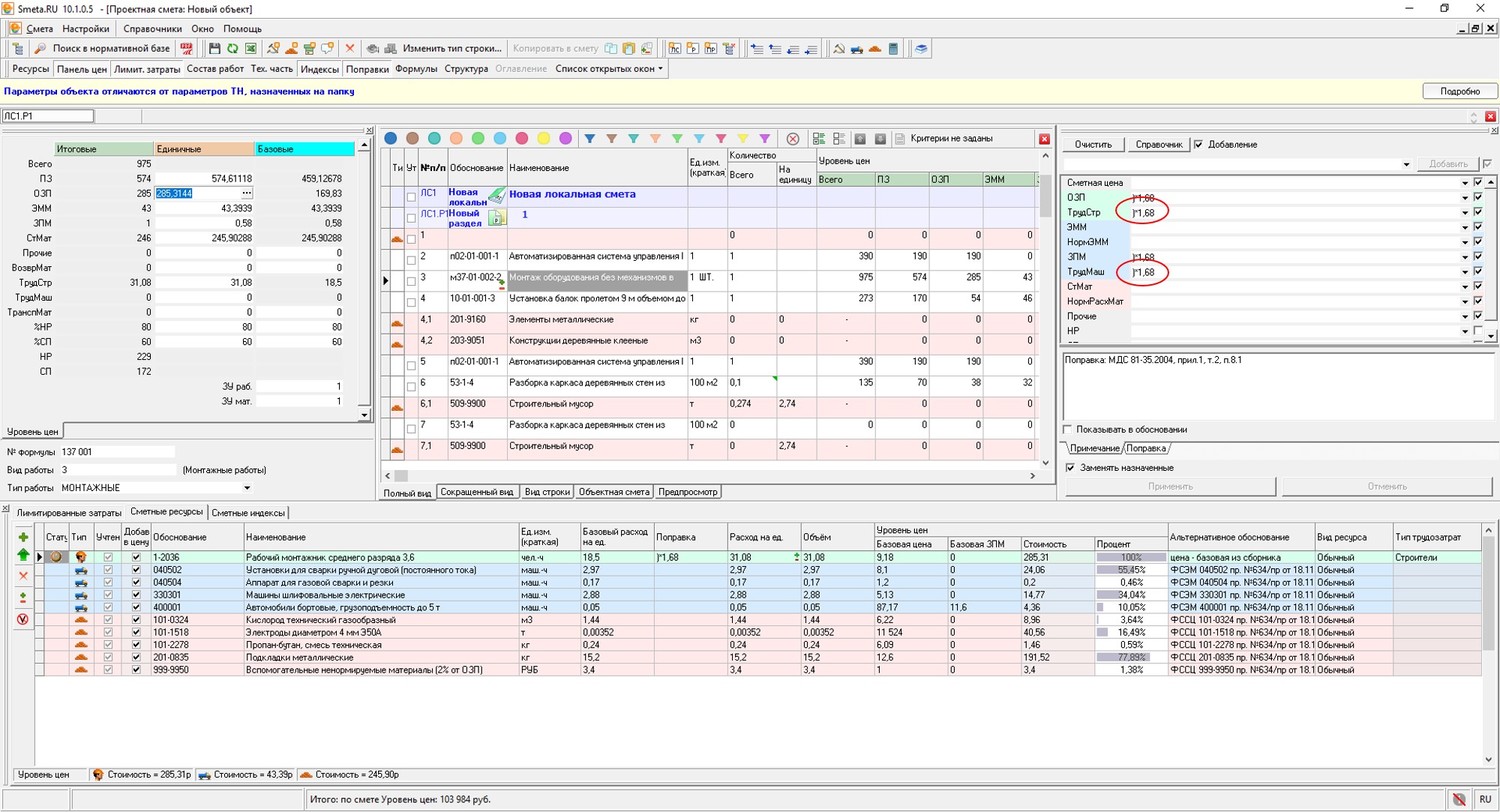При вставке в смету, выполненную ресурсным методом, поправок на подземные условия работ, поправки в расчете не участвуют.