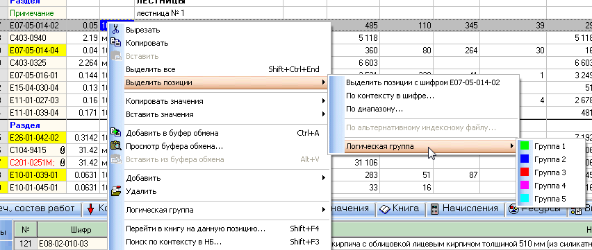 И в контекстном меню, вызываемом с любой строки сметы по ПКМ, есть расширенная команда "Выделить позиции", имеющая вложенные меню.