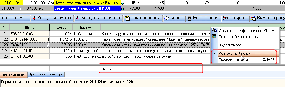 Кстати, комбинация клавиш <Ctrl+Shift+F> предназначена для поиска ресурса по его коду или наименованию в расценках текущей локальной сметы. При этом, переходить на строку вниз перед продолжением поиска необязательно.