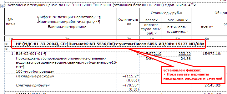 Выводит первой строкой в таблице с расценками текст: НР (МДС 81-33.2004), СП (Письмо № АП-5536/06) для эталона СНБ