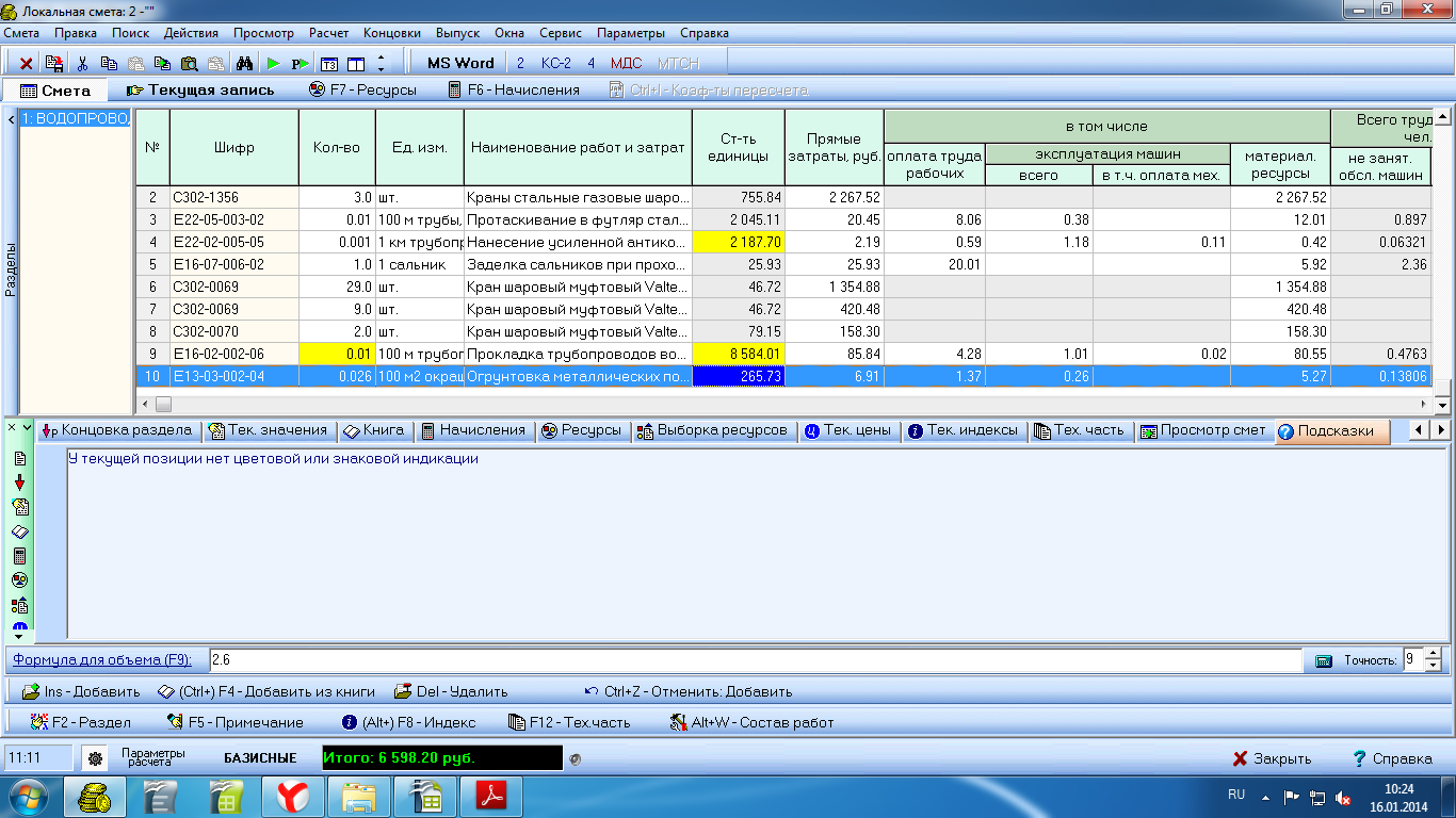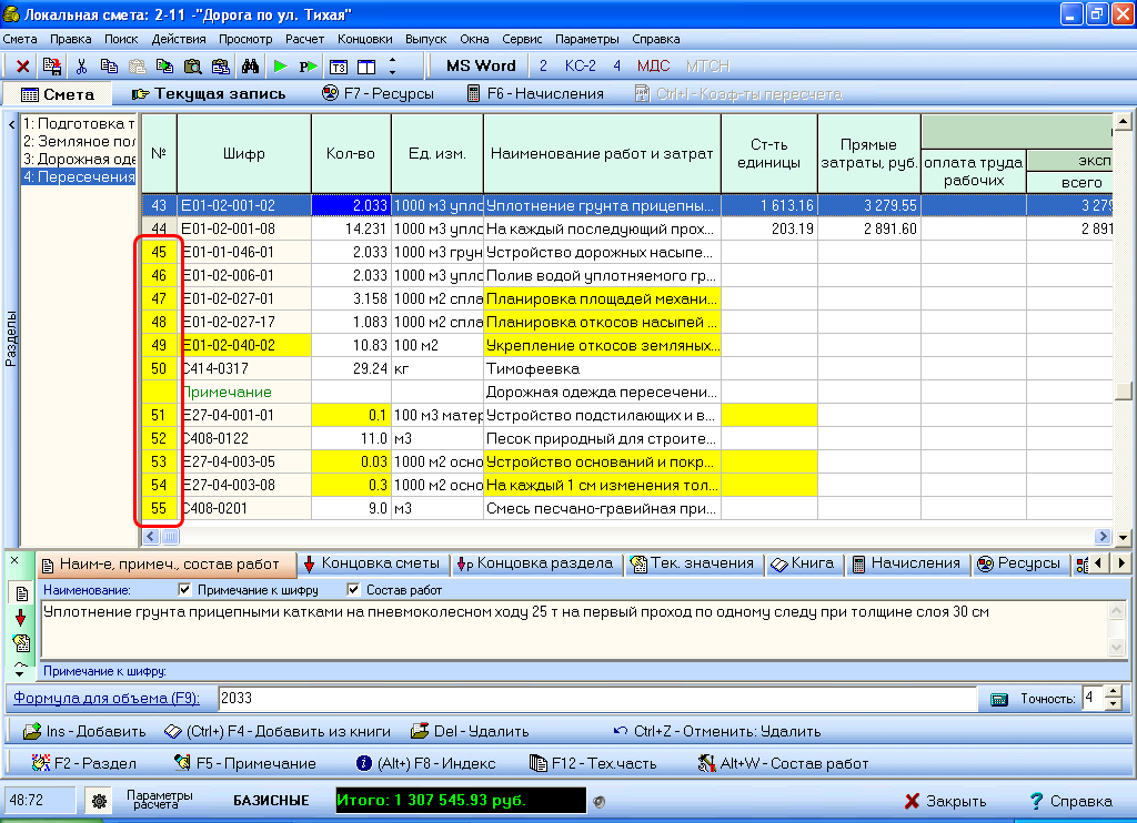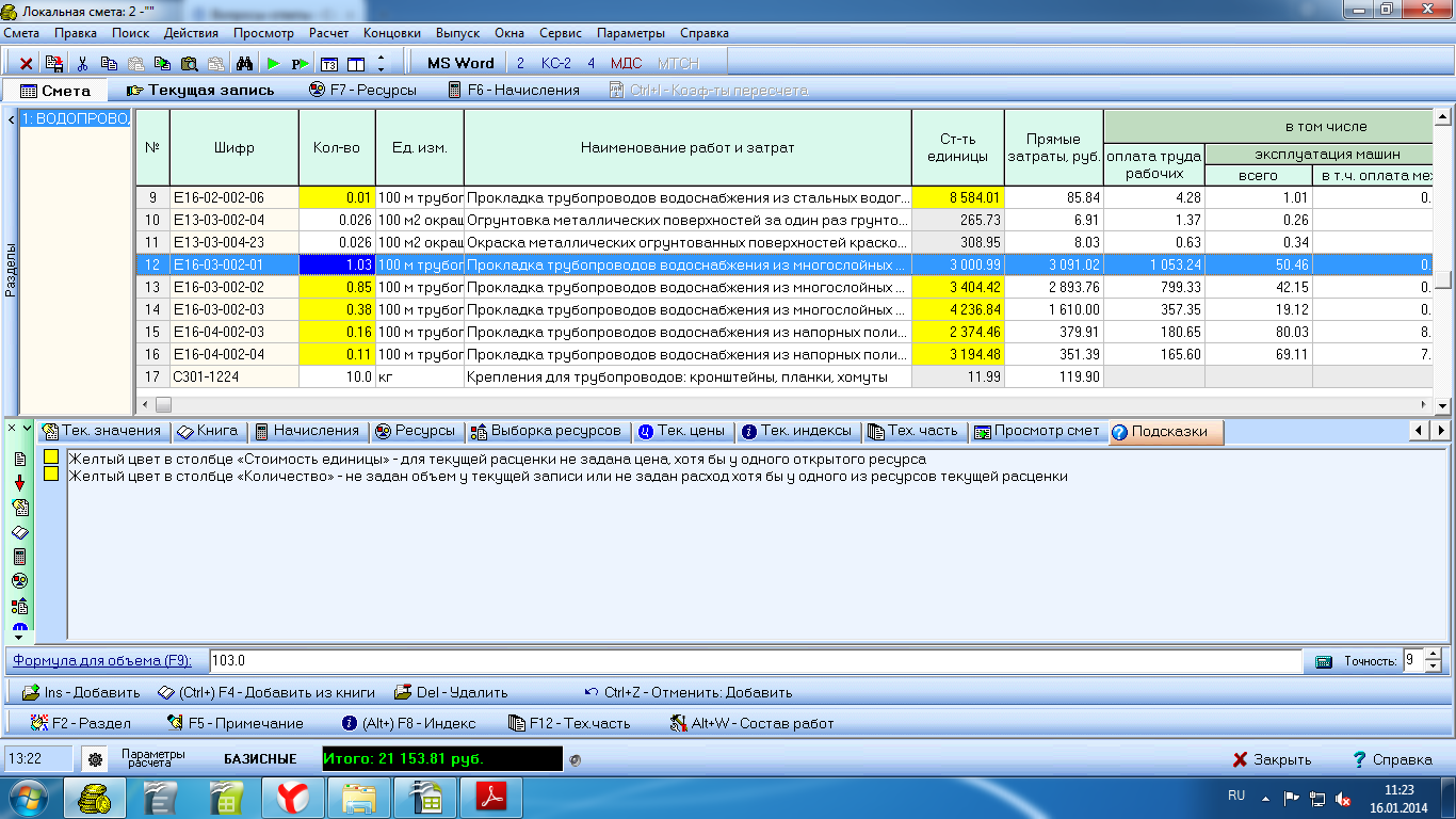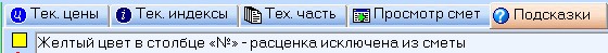 Есть смета. В смете есть несколько разделов. С последним разделом происходит что-то странное.... Позиции набраны, название расценки есть, показателей стоимости нет! Нажимаем "текущая запись", там внутри все составляющие расценки проставлены, а на экране сметы пусто. И желтым цветом подсвечены номера позиций (что это означает?).