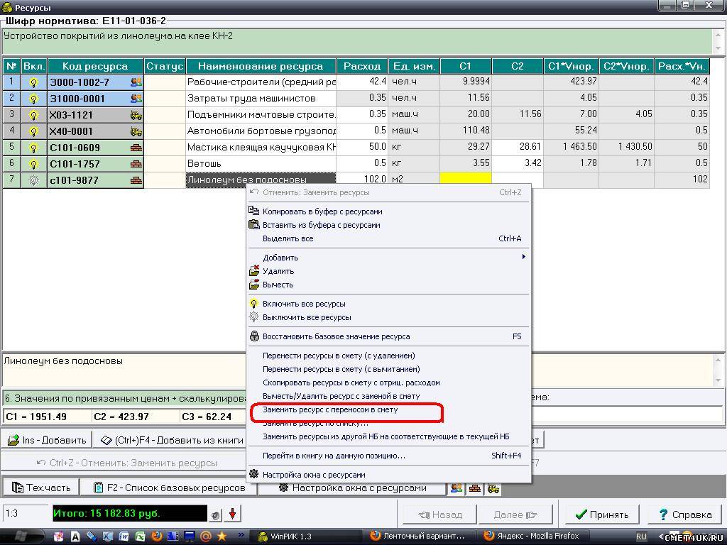 Что значит "все"? Прикрепили бы здесь что ли то, что у Вас получается. Я вот только что взяла расценку 11-01-036-2. Смотрю ресурсы. У предлагаемого расценкой линолеума цена=0. В таком случае Вы на нее можете не обращать никакого внимания (но можно и удалить данный ресурс) Выделяю линолеум и выбираю "Заменить ресурс с переносом в смету" Вот что получилось в выходной форме: