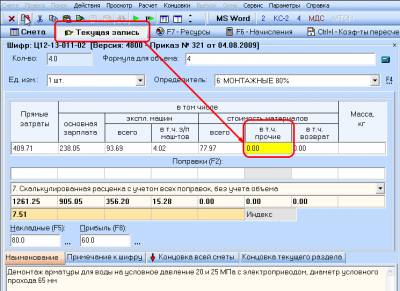 Из расценок на демонтаж по сборникам Цхх стоимость вспомогательных материалов, если уж очень хочется, убрать (чтобы не отображалась) всё-таки можно, как обычно – квадратно гнездовым методом. Для этого в окне "Текущая запись" вставьте в поле "стоимость материалов/в т.ч. прочие" значение "0.00".