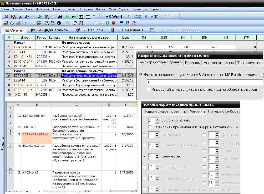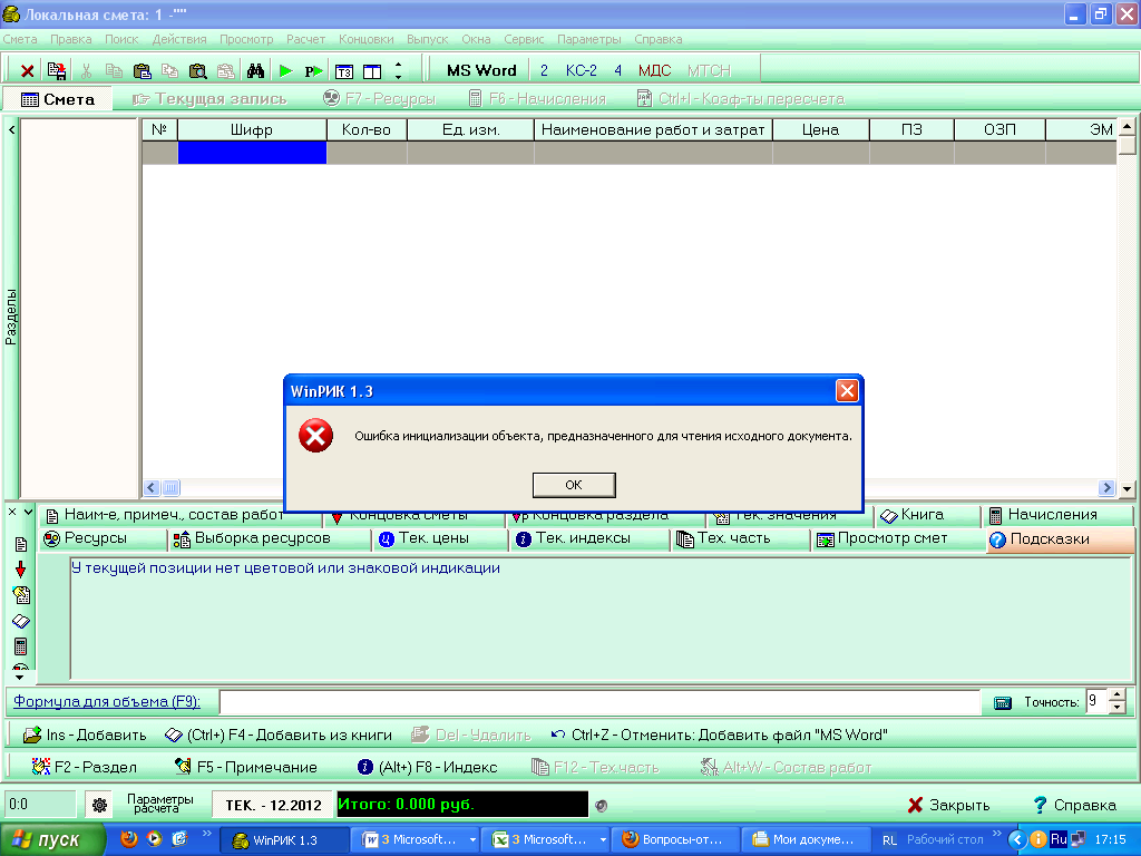 Офис 2007, настройки в Excel выполнены, прилагаемый пример сделан из сметы, выпущенной в Excel из РИКа, без объединения обоснования, наименования, ед.измерения (Ваши рекомендации внимательно изучал на форуме). Выбор способа ввода сметы делал и на стадии создания новой сметы (в окне выбора - кнопка файл WORD, EXCEL) и через импорт непосредственно в окне локальной сметы. Результат одинаковый - ошибка инициализации. Причем и дома, и на работе. На 2-х компьютерах стоят одинаковые версии РИКа, но с разными ключами, т.е. из разных установочных дисков. Конкретно проблему инициализации в поиске на форуме не нашел, посему и обращаюсь за помощью. Спасибо за внимание.