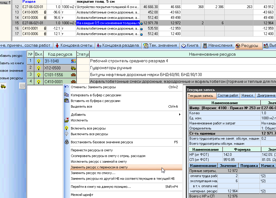 Заменяемые ресурсы поз.3 и поз.6 (С410-0006) не привязаны к расценке, вставлены вручную, отсюда и непонятные моменты возникают. А Вы перенос ресурсов с заменой в смету делайте из окна ресурсов командой ПКМ "Заменить ресурс с переносом в смету" – вероятность ошибки уменьшается.