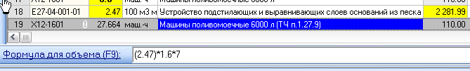 В данной ситуации (учесть добавку на доставку воды) такой способ (я его называю – "квадратно-гнездовой") использовать можно, но нужно чётко понимать что делаешь, а именно – в столбцы С1 и С2 должна быть внесена величина нормативных надбавок без учета базисной стоимости поливочной машины, т.е.: • ст-ть ЭММ -> С1 = 2,56 * <кол-во км> • ст-ть ЭПМ -> С2 = 0,19 * <кол-во км> базисная стоимость поливочной машины (Х12-1601) всё равно будет сидеть и рассчитываться в общей стоимости, а наше изменение только сделает добавку (открытого ресурса х12-1601) к базисной цене. Но это ошибочное решение!!! Т.к. стоимостные показатели будут верными, а расход ресурса х12-1601 будет занижен – ведь стоимость поливочной машины увеличивается из-за увеличения времени её работы – на 1,6 маш.-ч на каждый километр сверх 5 км доставки воды. Сообщение #4 я подкорректировал.