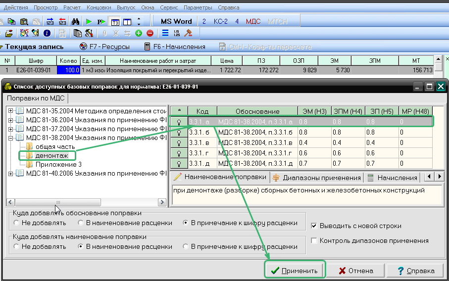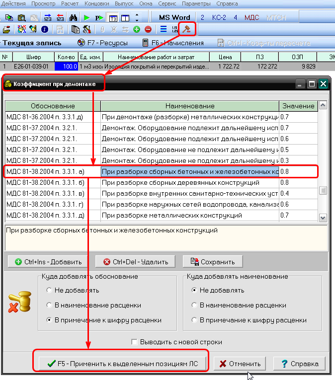 МАТх1,15 – это ошибочно... Если какие-то коэффициенты в поправках или начислениях к позиции установлены, выставите их в = 1. Вариант 1: • кнопочка или меню "Действия->Применить коэффициенты при демонтаже (разборке) Alt+D" и далее как на скриншоте 1: