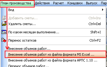 Команда «Внесение объемов работ из файла формата MS Excel» позволяет вносить в текущий период для текущего исполнителя объемы работ из файлов Excel, выпущенных по форме «Форма КС-2 Импорт» из идентичного плана производства на другом компьютере командой меню "Выпуск -> Выпуск в Microsoft Excel -> Формы КС-2 -> Форма КС-2 Импорт"