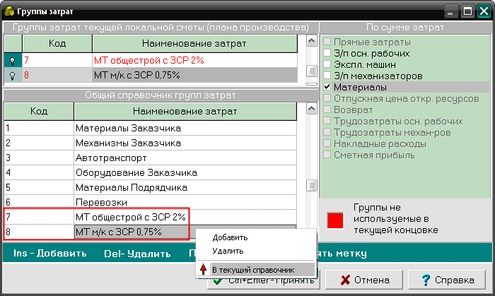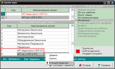 Справка по работе с группами затрат – по одноименной кнопке в окне "Группы затрат"