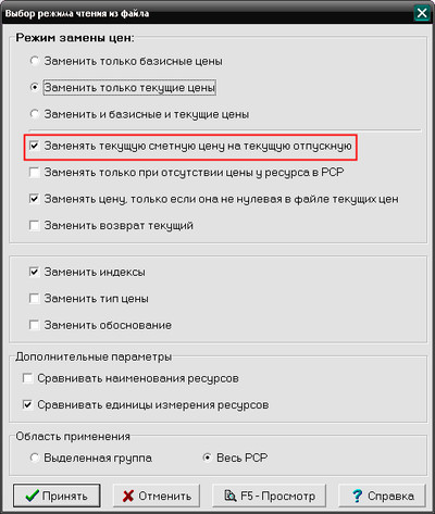 • в ресурсном расчете при выполнении команды "Файл -> Считать из файла" в окне "Выбор режима чтения..." установить галочку "Заменить текущую сметную цену на текущую отпускную"
