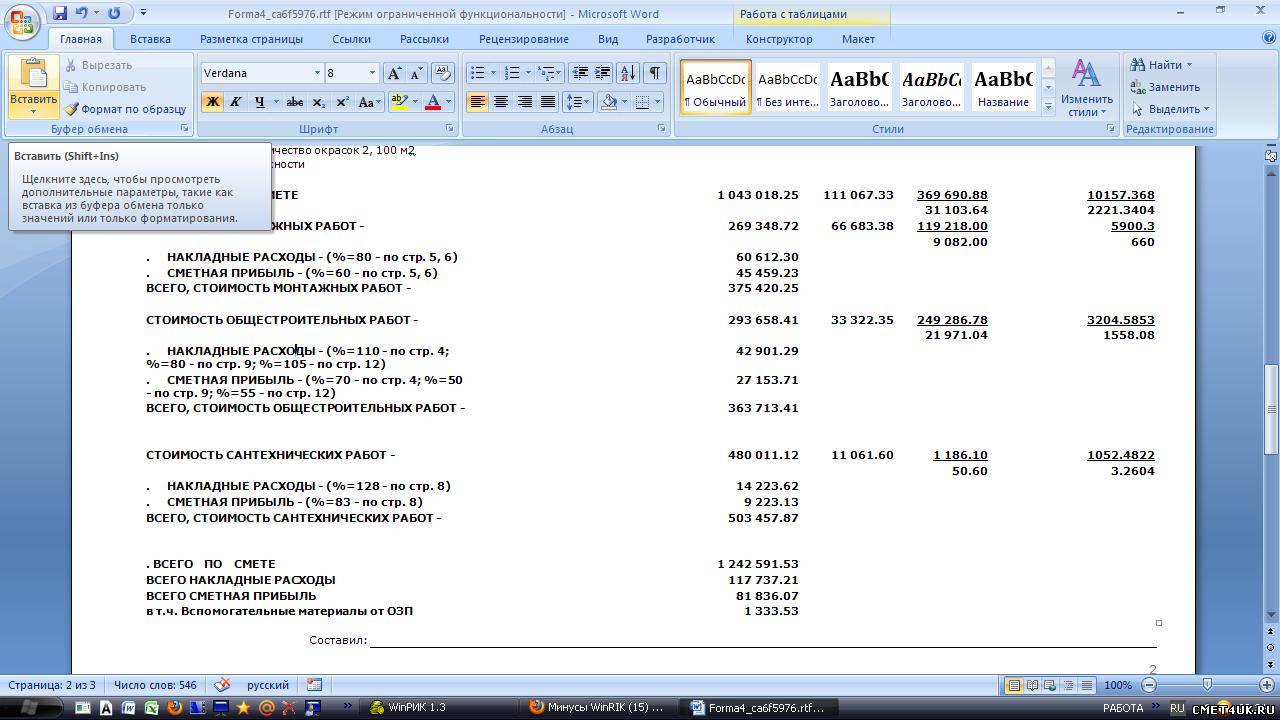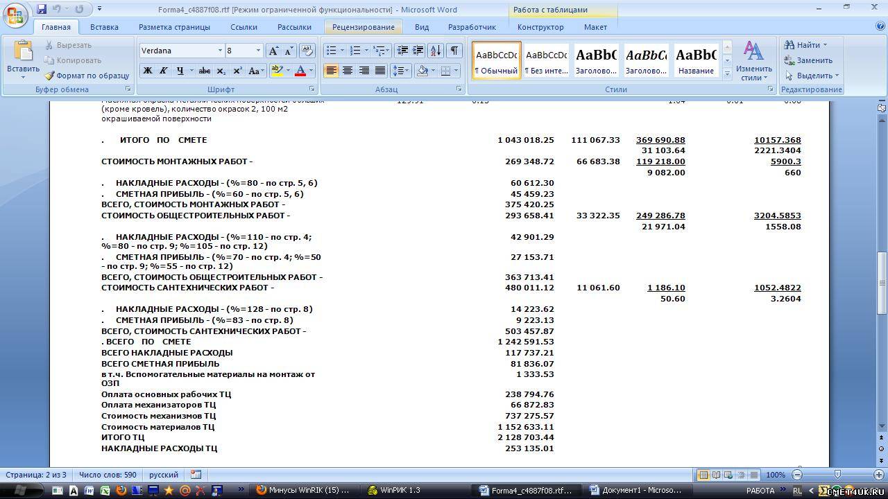 Еще мне не нравится, что в концовке выходной формы виды работ сливаются (не наглядно концовка выходит). Например, в прикрепленном файле: Всего стоимость монтажных работ 375420,25. Было бы лучше, если б за этой строкой была одна пустая строка, чтобы сразу бросалось в глаза, что дальше уже идут Общестроительные работы. (Тоже самое и с сантехническими и др. работами)