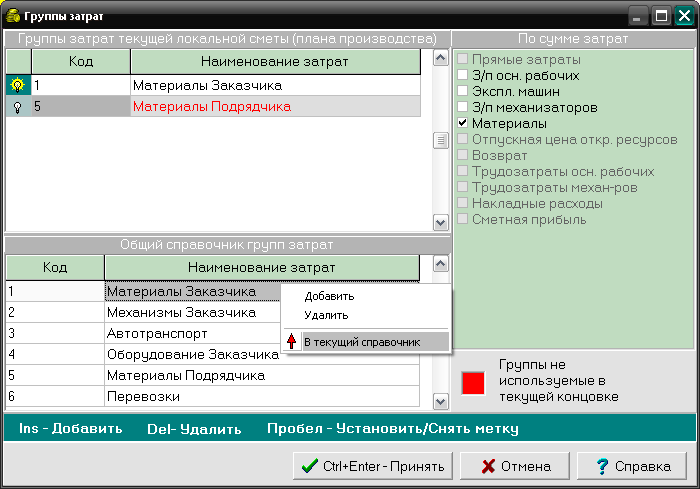 Для тех, кто хочет воспользоваться «группой затрат» и не знает как -> меню «Действия» -> «Группы затрат» - в появившемся окне нажимаем кнопку СПРАВКА (она с подробным описанием)