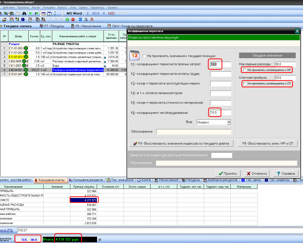 Подскажите или куда-нибудь пошлите... Есть смета в ТЕР с региональными индексами по стаьям затрат по каждой расценке. Надо переделать с единым индексом к СМР минрегиона. Вставляю в параметрах использовать единый К1, а что с НР и СП? Не пересчитываются. В параметрах НР и СП стоит "брать по каждой норме" и всё.