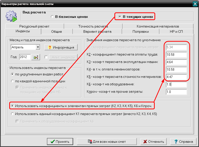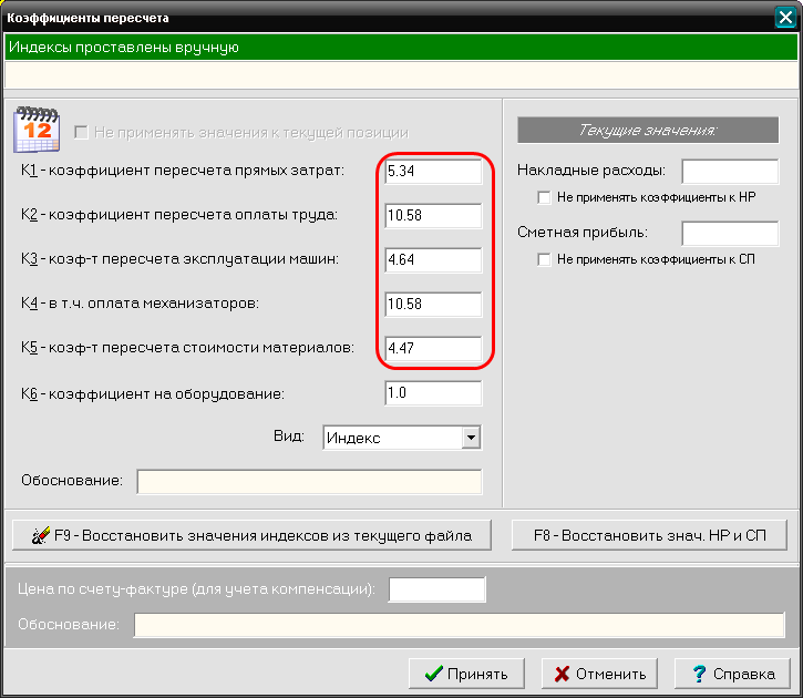 Galina53, не, у меня смета в программе в базисных ценах. а формы типа 4 по старым кварталам уже в актуальных на тот момент. как мне передали через третьи руки, там цены умножены на коэффициент 5,21. вот я пытаюсь найти, где в программе это делается... индекс только в концовке бухгалтерию не устраивает, им нужны "нормальные" цены по каждой позиции. ещё так спрошу: опытные сметчики что делают с этим ежеквартальным коэффициентом? куда вы его пишете обычно? или вы покупаете диск с актуальными ценами, а коэффициент бесполезен?