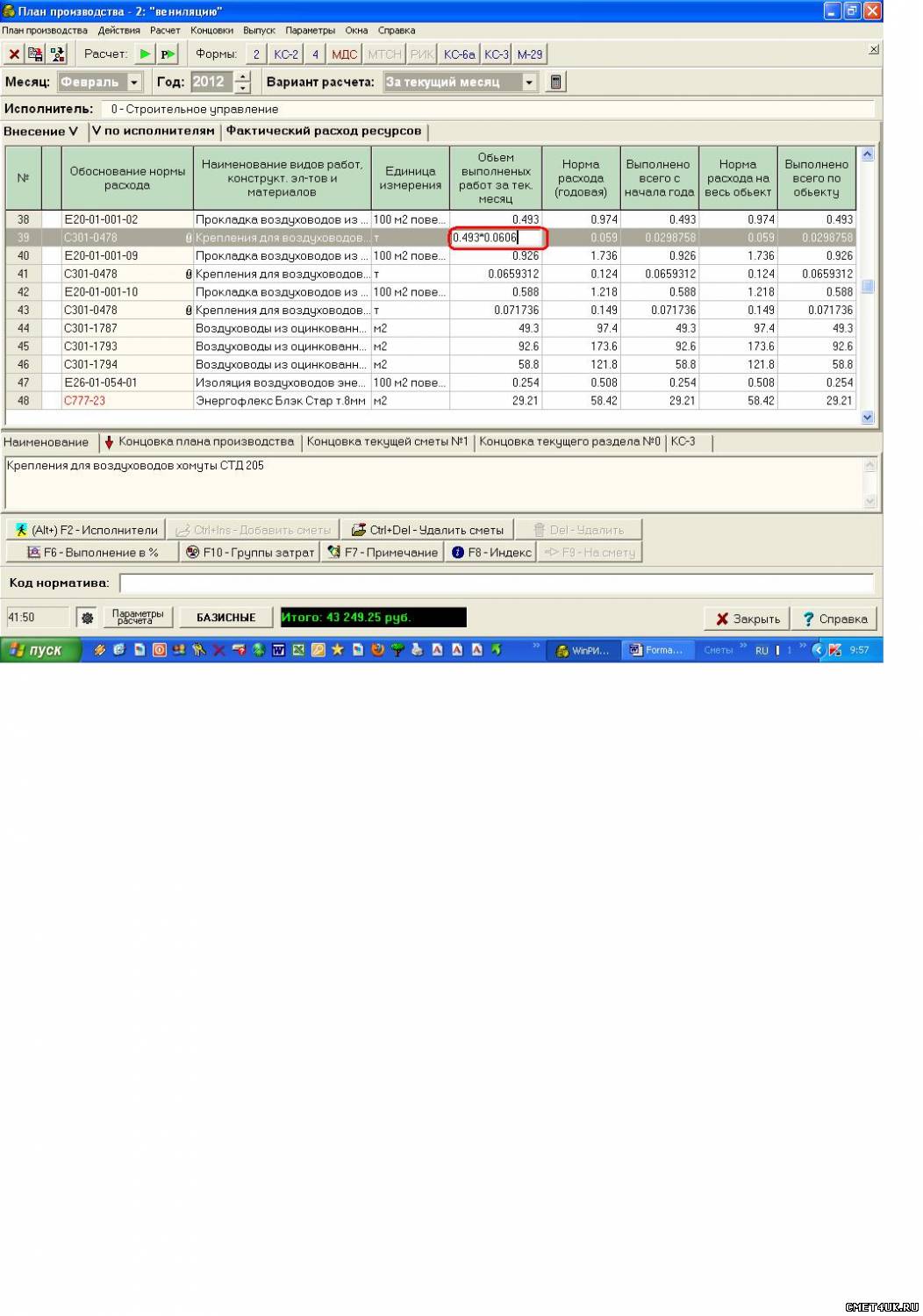 в п.39 окна "План производств" пишу: 0,493*0,0606 (как в прикрепленном файле №2), нажимаю Enter и вижу, что все в порядке, в п.39 появился правильный объем, равный 0,0298