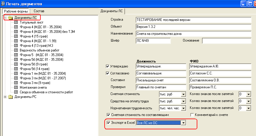А можно посмотреть на мою картинку: - Заходим в экран печати любой ЛС. - Встаем на уровень Документы ЛС (если версия до 1.6.5. включительно) или Форма 4 Локальный сметный расчет (версия 1.6.6 и далее) - Нажимаем кнопку "Экспорт в Ехсеl" - Выбираем Опцию "Все ЛС из ОС" - Переходим на необходимую форму и печатаем