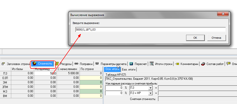 Можно воспользоваться пересчетом на строку типа Индексация ПЗ (название пересчета можно изменить). Но там можно ввести только одно действие, например, 5000/1,18. Для второго действия надо ввести еще один пересчет. А можно ввести выражения для расчета стоимости на ПЗ во вкладке Стоимость (см. рис). При печати поставить опцию "Формулы расчета стоимости по строке" и вы получите требуемый результат.