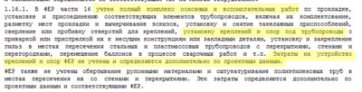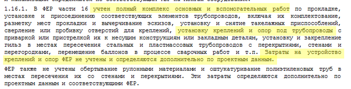 И да - последняя редакция техчасти: 1.16.1. В ФЕР сборника 16 предусмотрен полный комплекс основных и вспомогательных работ по прокладке, установке и присоединению соответствующих элементов трубопроводов, включая их комплектование, разметку мест прокладки и вычерчивание эскизов, установку и снятие такелажных приспособлений, сверление или пробивку отверстий для креплений, установку креплений и опор под трубопроводы с приваркой или пристрелкой их к несущим конструкциям или закладным деталям, установку и закрепление гильз в местах пересечения стальных и пластмассовых трубопроводов с перекрытиями, стенами и перегородками, перемещение баллонов в процессе сварочных работ и т.п. Стоимость креплений и опор расценками не учтены и определяются дополнительно по проектным данным.