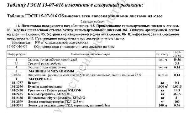 Таблица ГЭСН 15-07-016 Облицовка стен гипсокартонными листами на клее